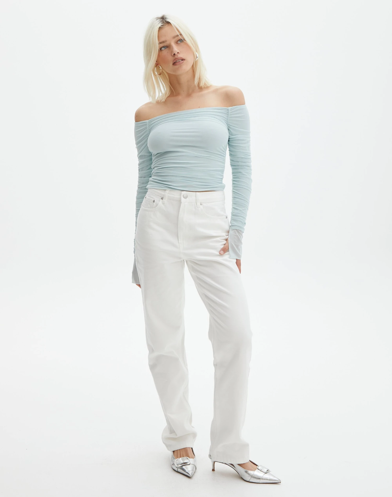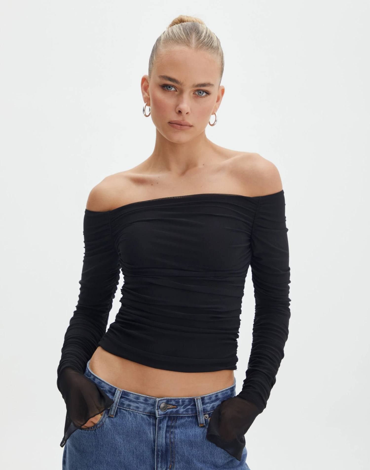 Ruched Mesh Off The Shoulder Top
